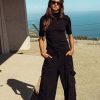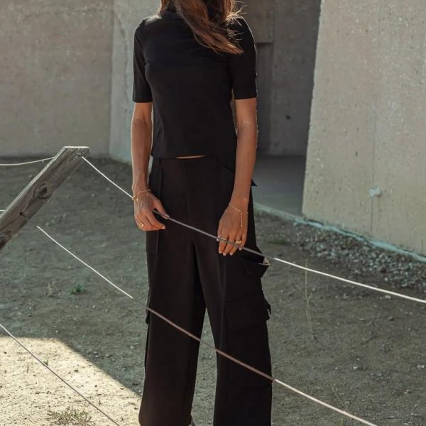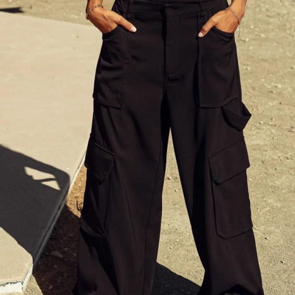High Rise Back Elastic Waist Zipper and Clasp Closure Wide Leg Two Deep Front and Two Back Pockets Two Deep Leg Pockets Utility Strap on Left Leg Non Stretch Material 100% Polyester Hand Wash Cold, Line Dry Model Info Height: 5’7″ Wearing Size: Small