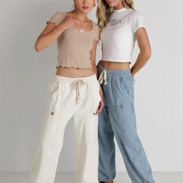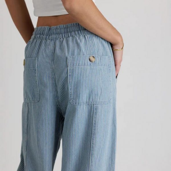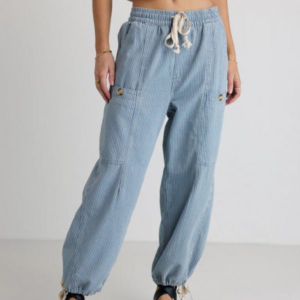 Elastic Waist with Braided Tie High Rise Two Hand Pockets Two Leg Pockets with Button Closure Two Back Pockets with Button Closure Braided Drawstring Cuffs Striped Pattern 70% Cotton, 30% Polyester Hand Wash Cold, Line Dry Keep things loose and playful with the Robyn Striped Pants in Denim. These soft bottoms are so fun and are sure to keep you comfortable. Pair with a baby tee and your favorite sandals. Model Info Height: 5’8″ Wearing Size: Small Fit: True to Size