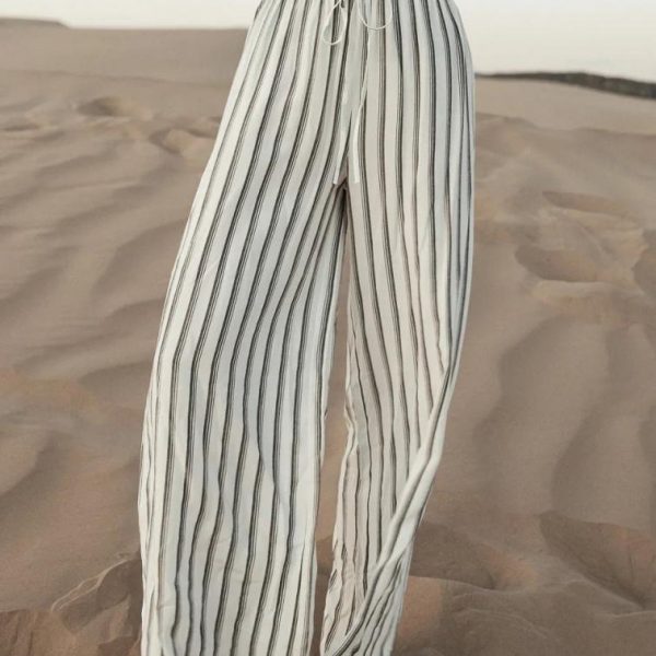 Elastic Waist Drawstring Ruffled Top Edge Raw Bottom Hem Striped Pattern Slightly See Through Non-Stretch 80% Linen, 20% Viscose Machine Wash Cold, Tumble Dry Low We adore the Ronan Striped Pants for their breathable and airy feel. These pants are sure to keep you looking great and feeling comfortable all day. For shopping or a coffee date, pair them with a graphic tee and white sneakers. Model Info Height: 5’8″ Wearing Size: X-Small Fit: No Stretch in Thighs– If Between Sizes, Size Up
