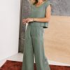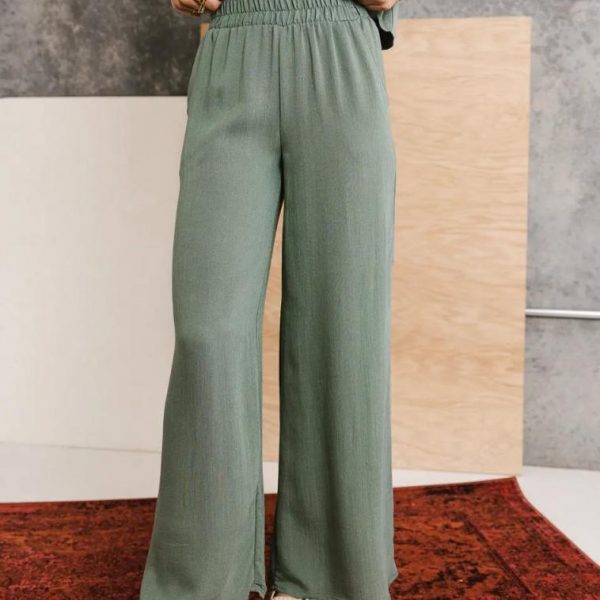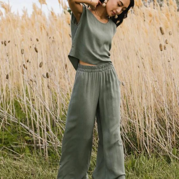 Elastic Waist Two Hand Pockets Wide Leg Non-Stretch Material Slightly See Through 95% Rayon, 5% Nylon Machine Wash Cold, Flat Dry Matching Pieces Sold Separately Introducing the Maren Pants in Sage. These pants are ready to take on any adventure with you from boardwalk strolls to mid morning brunches. Style it with its matching top or mix it up with a graphic tee. Model Info Height: 5’7″ Wearing Size: Small