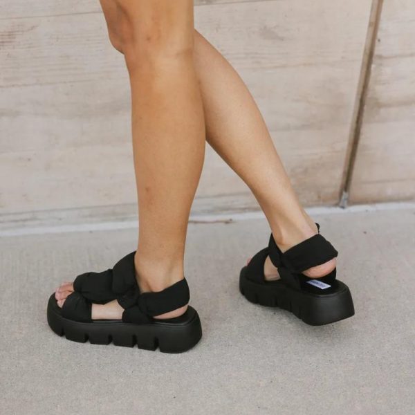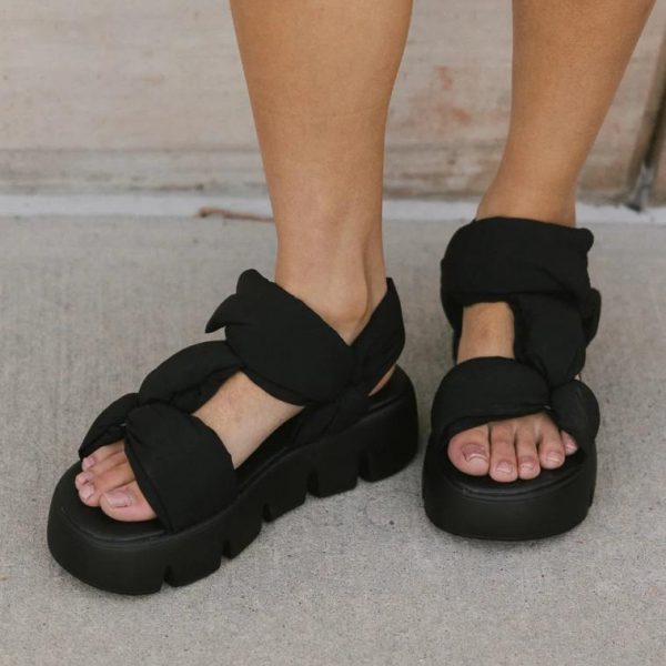 Puffy Flatform Sandal Top Strap Closure Lugged Sole Vegan Leather Textile Upper 1.75″ Heel Fits True to Size **For more specific information on the product, please feel free to email us webteam@bohme
