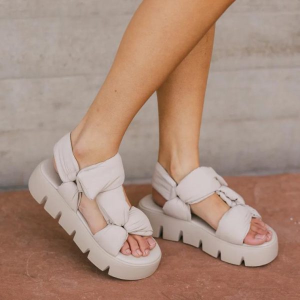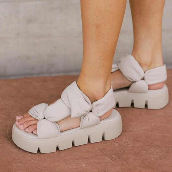 Puffy Flatform Sandal Top Strap Closure Lugged Sole Vegan Leather Textile Upper 1.75″ Heel Fits True to Size  **For more specific information on the product, please feel free to email us webteam@bohme