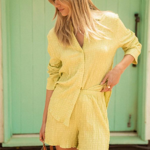 Elastic Waist Tow Hand Pockets High Rise Textured Lightweight Material 95% Polyester, 5% Elastane Hand Wash Cold, Line Dry MATCHING PIECES SOLD SEPARATELY Model Info: Height: 5’9” Wearing Size: Small Small Measurements: Waist: 26″-30″, Rise: 11.5″, Inseam: 4.5″ **For more specific information on the product, please feel free to email us at webteam@ bohme