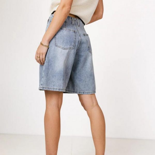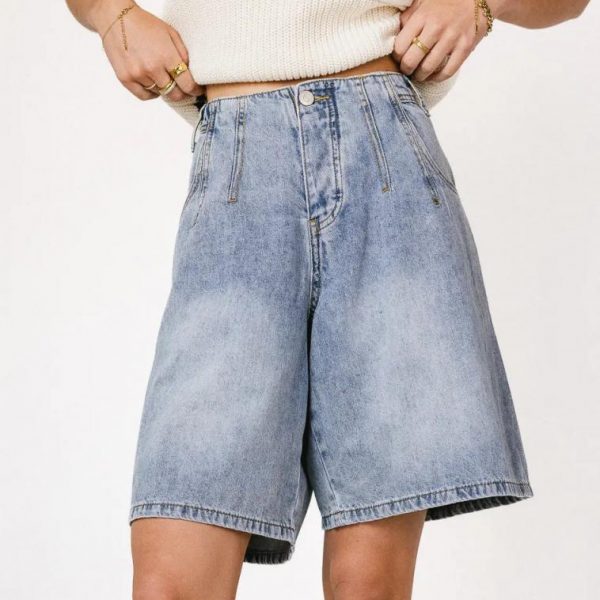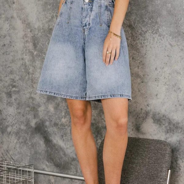High Rise Button and Zipper Closure Dart Seam Detail Two Front and Back Pockets Wide Leg Fit Non-Stretch Material 95% Cotton, 5% Polyester Machine Wash Cold, Tumble Dry Low  Your search for the perfect bermudas is over, now that you’ve found the Mary Jane Denim Bermudas. These high rise bottoms are lightweight to combat those hot summer days. Pair with a cropped tee and a hair bow and you’re ready to shine this season. Model Info  Height: 5’7″  Wearing Size: Small