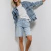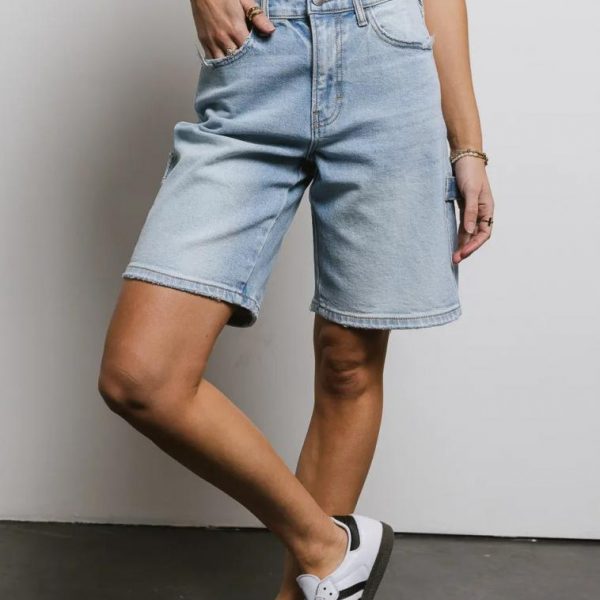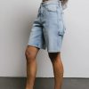 High Rise Bermuda Distressed Left Utility Strap Right Utility Pockets Button and Zipper Closure Slight Stretch 99% Cotton, 1% Spandex Machine Wash Cold, Tumble Dry Low Model Info Height: 5’7″ Wearing Size: 23
