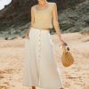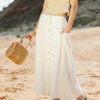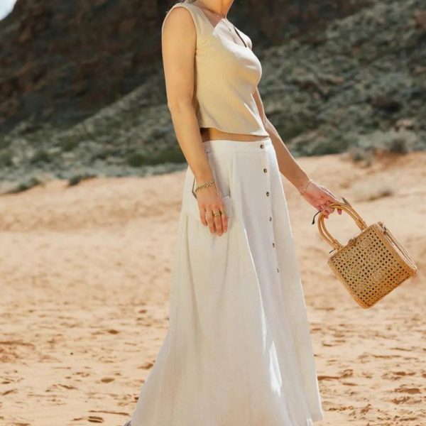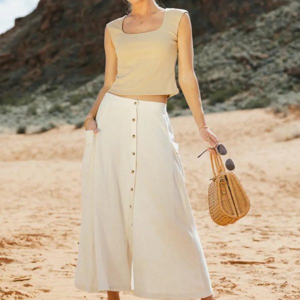 Elastic Back Waist Functional Front Button Closure Two Side Pockets 70% Rayon, 30% Linen Hand Wash Cold, Lay Flat to Dry Model Info Height: 5’7″ Wearing Size: Small Measurements: Waist: 24″-27″, Length: 34″