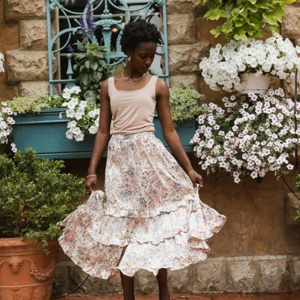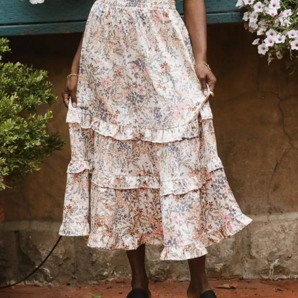 Floral Pattern Elastic Waist Three Tiers Ruffle Two Hand Pockets Non Stretch Material 100% Polyester Hand Wash Cold, Hang Dry  Model Info Height: 5’5″ Wearing Size: Small  Fit: If Between Sizes, Size Up