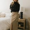 Elastic Waist Two Slit Hand Pockets Two Side Pockets with Adjustable Draw Cord and Snap Buttons Maxi Length Front 18.5″ Slit Soft Stretch Material 88% Nylon, 12% Spandex Machine Wash Cold, Tumble Dry Low Model Info: Height: 5’7″ Wearing Size: Small