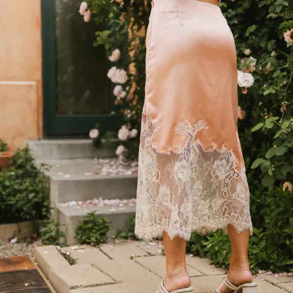 Zipper on Wearer’s Left Asymmetrical Lace Hem Seam Mini Skirt Liner Self: 100% Polyester Contrast: 100% Cotton Lining: 100% Polyester Hand Wash Cold, Line Dry Weddings and formal dinners just got a whole lot better with the Frankie Asymmetrical Skirt in Peach as your plus one. Light colored blouses are the perfect addition to any outfit this skirt starts. Model Info Height: 5’7″ Wearing Size: Small Fit: True to size