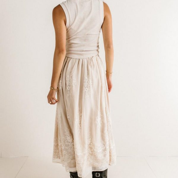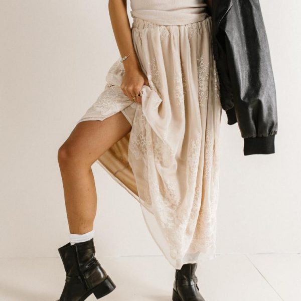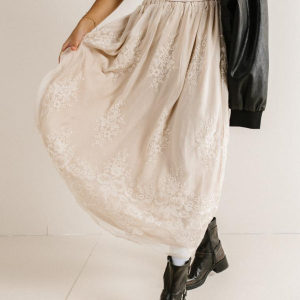 Elastic Waist Embroidered Floral Detail Fully Lined Non Stretch Material 100% Polyester Hand Wash Cold, Line Dry  Neutral colors with elegant materials– That’s why we live for the Grace Floral Tulle Skirt in Champagne. This maxi skirt has all the makings of a perfect evening wear bottom. Style it with a strappy heel. Model Info  Height: 5’8”  Wearing Size: X-Small