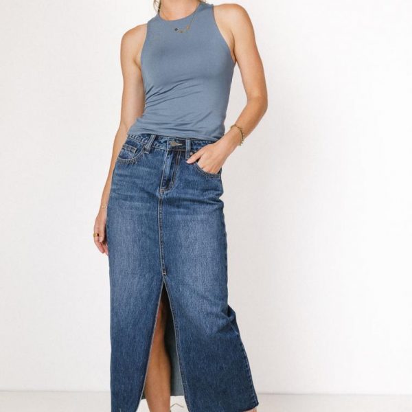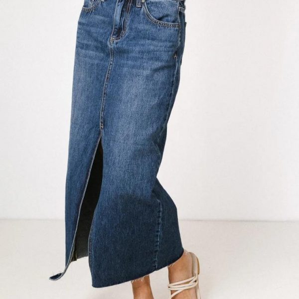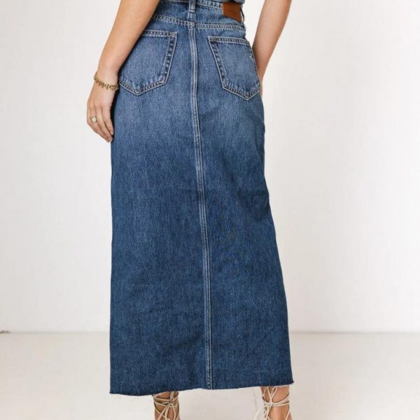 Maxi Length Distressed Raw Hem 18.5″ Front Slit Two Front Pockets Two Back Pockets Slight Stretch Material 100% Cotton Machine Wash Cold, Tumble Dry Low  Classic and trendy, the Paydrie Denim Maxi Skirt is everything you could want in a dark denim piece. This skirt can be dressed up or down depending on your style. For a fun summer look, we recommend pairing with a boxy tee and sunglasses. Model Info  Height: 5’7″  Wearing Size: X-Small