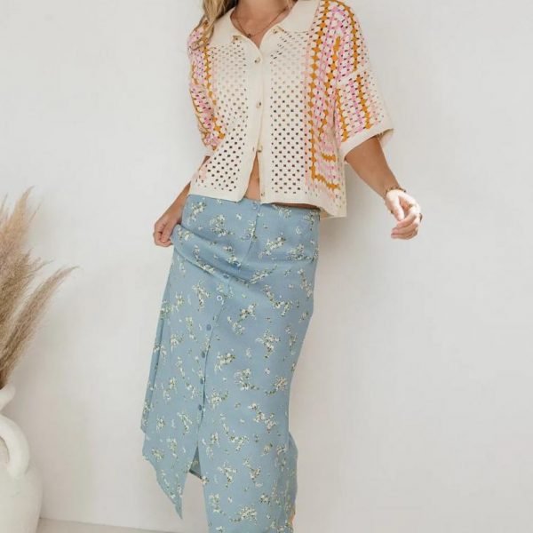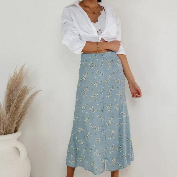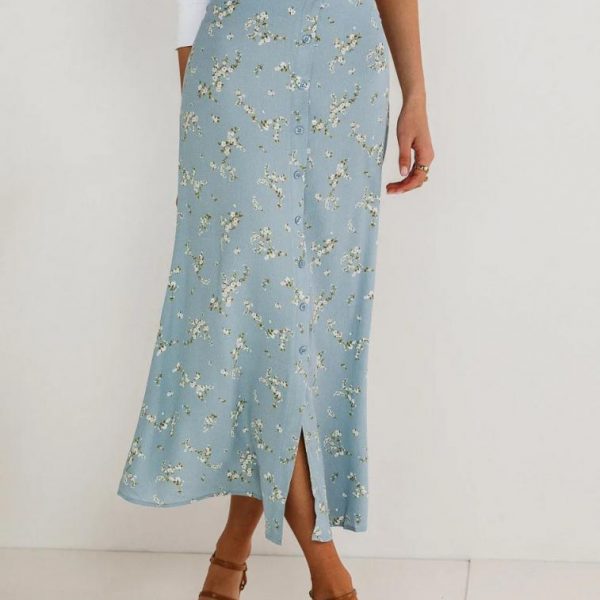 Right Side Zipper Closure Non Stretch Material Non Functional Buttons on Front  Ditsy Floral Pattern Middle Slit on Front 100% Rayon Turn Inside Out Hand Wash Cold, Lay Flat to Dry   Higher temps, lower hems. Welcome in spring with the Rory Floral Skirt in Blue. This beautiful skirt is best styled with any white top and some strappy sandals. Model Info  Height: 5’7″  Wearing Size: Small   Measurements: Waist: 26″, Length: 35″