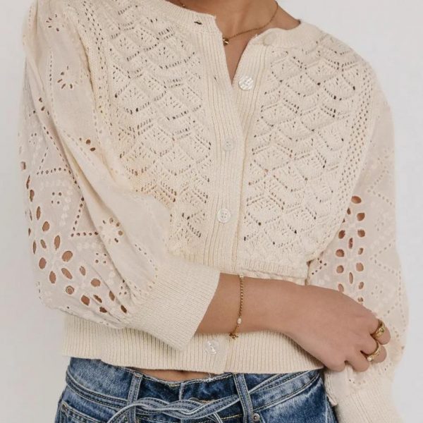 Round Neckline Front Functioning Buttons Crochet Knit Body Eyelet Lace 3/4 Sleeve with Ribbed Cuff Cropped Fit Stretch Knit Material 100% Cotton Hand Wash Cold, Line Dry  Model Info  Height: 5’8″  Wearing Size: Small  Measurements: Bust: 39″, Length: 16.5″  **For more specific information on the product, please feel free to email us at webteam@ bohme