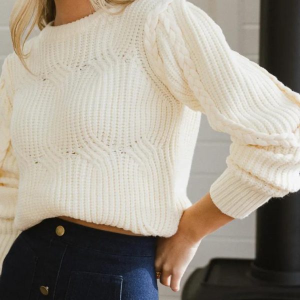 Round Neck Long Sleeves Cable Knit Braided Detail on Shoulders and Sleeves Stretch Knit Material 45% Viscose, 28% Polyester, 27% Nylon Hand Wash Cold, Line Dry  Model Info  Height: 5’7″  Wearing Size: Small