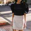 Round Neckline Short Puff Sleeves with Pleat Back Keyhole Closure Contrast Seam Slight Stretch Material 80% Cotton, 15% Polyester, 2% Spandex Hand Wash Cold, Line Dry The Aubree Denim Top in Dark Wash is back just in time for spring! The puff pleated sleeves are our new fixture. Dress this top up with a white flowy maxi skirt and some sandals. Model Info Height: 5’8” Wearing Size: Small