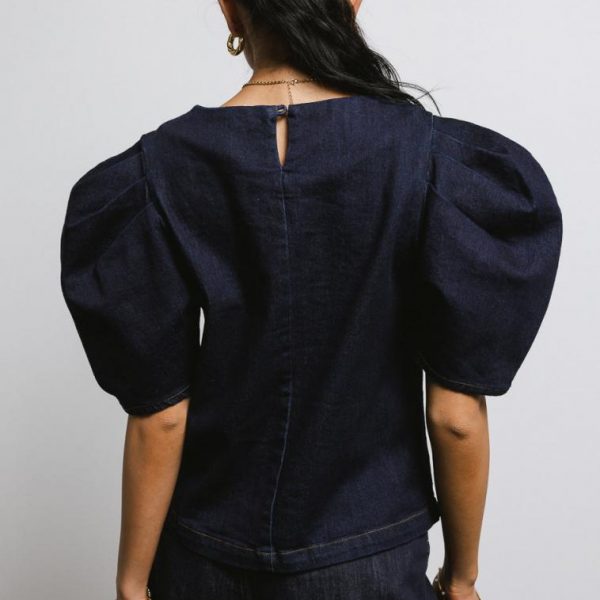 Round Neckline Short Puff Sleeves with Pleat Back Keyhole Closure Contrast Seam Slight Stretch Material 80% Cotton, 15% Polyester, 2% Spandex Hand Wash Cold, Line Dry The Aubree Denim Top in Dark Wash is back just in time for spring! The puff pleated sleeves are our new fixture. Dress this top up with a white flowy maxi skirt and some sandals. Model Info Height: 5’8” Wearing Size: Small