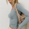 Square Neckline Long Sleeves Lightweight Ribbed Knit Stretch Material 92% Rayon, 8% Spandex Machine Wash Cold, Tumble Dry Low Model Info Height: 5’7″ Wearing Size: Small