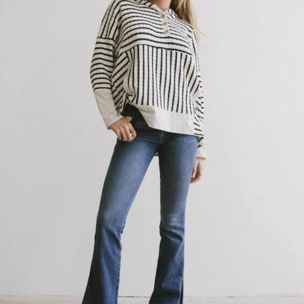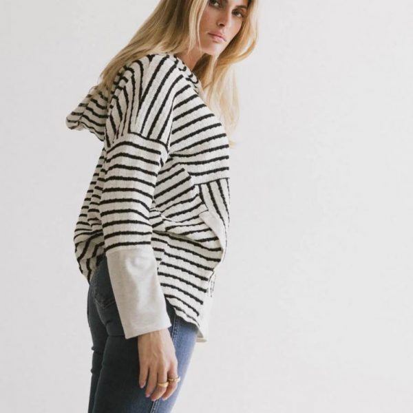 Four Button Neckline Hooded Long Sleeves Contrast Cuff and Trim Hoodie Pocket Oversized Fit Stretch Material 95% Polyester, 5% Spandex Hand Wash Cold Water Only Model Info Height: 5’9″ Wearing Size: Small