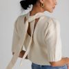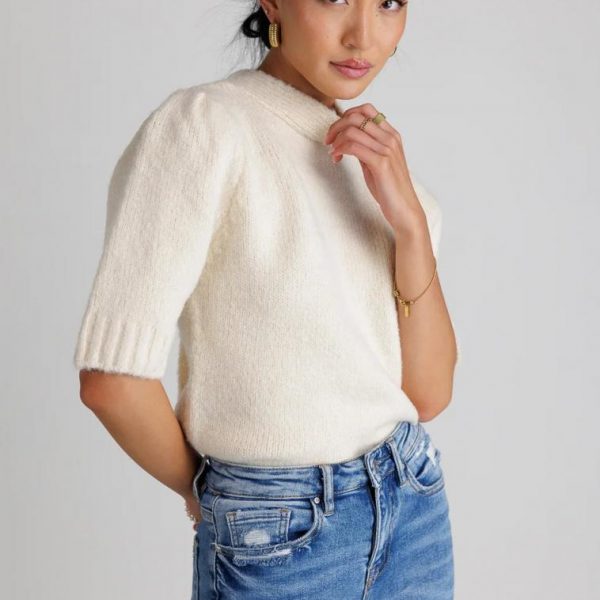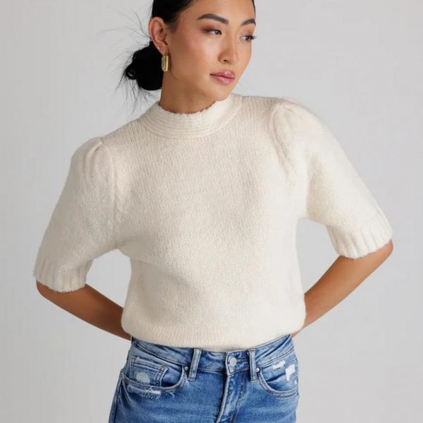 Mock Neckline Short Sleeves Tie Back Sweater Back Cut Out Detail Stretch Knit Material 73% Acrylic, 14% Nylon, 10% Wool, 3% Spandex Hand Wash Cold, Line Dry Model Info Height: 5’8″ Wearing Size: Small