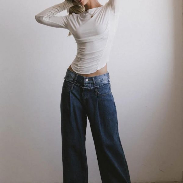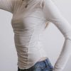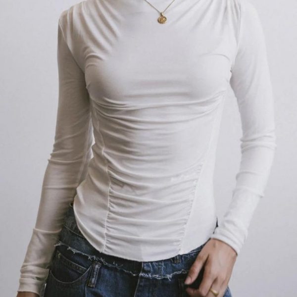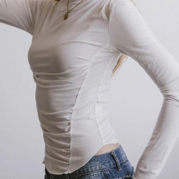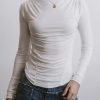Ruched Torso Detail Wide Boat Neckline Long Sleeves Serged Scoop Hemline Stretchy Material Slightly See Through 93.2% Lyocell, 6.8% Spandex Machine Wash Cold, Hang Dry Model Info Height: 5’7″ Wearing Size: X-Small