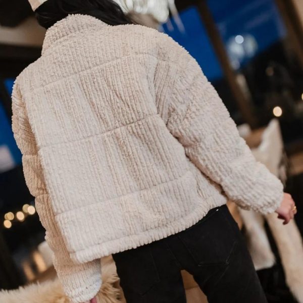 Soft Faux-Fur Zip Up Mock Neck  Long Sleeves with Elastic Cuffs Two Front Slit Hand Pockets Adjustable Drawstring Bottom Lined Shell: Faux Fur, Lining & Filler: 100% Polyester Hand Wash Cold, Hang to Dry  Model Info  Height: 5’6″  Wearing Size: Small