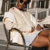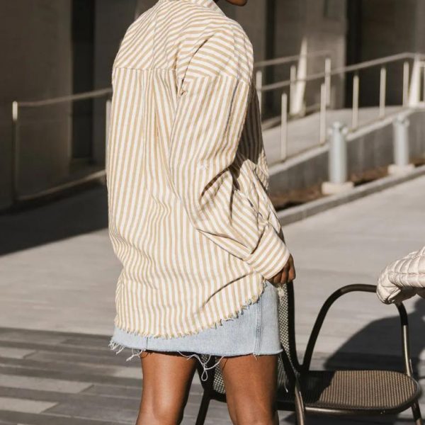 Collared Neckline Seven Functional Buttons Long Sleeves with Two Button Cuff 3/4 Convertible Sleeve Tab and Button Contrast Striped Chest Pocket Distressed Raw Scoop Hemline Box Pleat on Back See Through, Non-Stretch Material 100% Cotton Gentle Wash Cold, Hang Dry  Striped button ups are all the rage, but the Brenn Button Up in Brown takes the cake. This top can show out at any event or occasion. Grab your favorite pair of slacks for a business casual look. Model Info Height: 5’5″ Wearing Size: Small