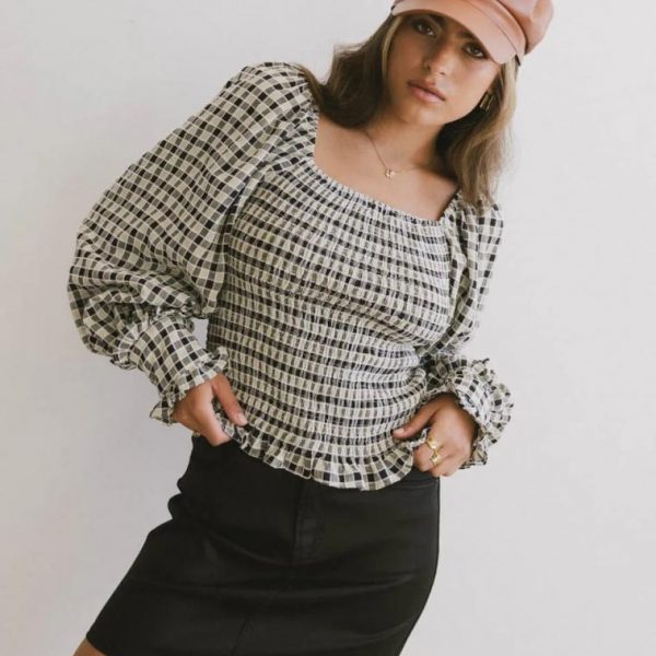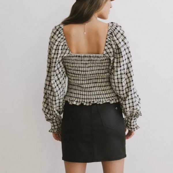 Elastic Square Neckline Long Puff Sleeves Button Cuffs with Ruffles Smocked and Lined Bodice Gingham Pattern with Flocked Lines 65% Polyester, 35% Rayon Hand Wash Cold, Line Dry Model Info Height: 5’5″ Wearing Size: Small