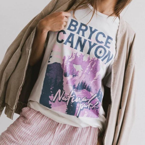 Ribbed Crew Neckline Short Sleeves Bryce Canyon Graphic Slightly See Through Stretch Knit Material 100% Cotton Hand Wash Cold, Line Dry Model Info Height: 5’8″ Wearing Size: S/M