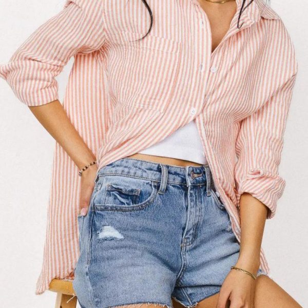 Collared Neckline Seven Functional Buttons Long Sleeves with Two Button Cuff Wearer’s Right Chest Pocket Scoop Hemline Raw, Distressed Hem 100% Cotton Hand Wash Cold, Line Dry  Sweet as can be, the Clementine Striped Button Up is a citrus colored, summer favorite. The distressed make this shirt is perfect for casual events. Complete your outfit with some light wash denim and some sandals. Model Info Height: 5’7″ Wearing Size: Small