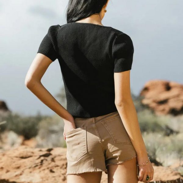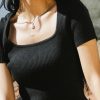 Square Neckline Stretch Ribbed Material Cropped Fit 52% Rayon, 28% Polyester, 20% Nylon Hand Wash Cold, Lay Flat to Dry  Model Info  Height: 5’8″  Wearing Size: Small  Measurements: Bust: 26″, Length: 18″  **For more specific information on the product, please feel free to email us at webteam@ bohme