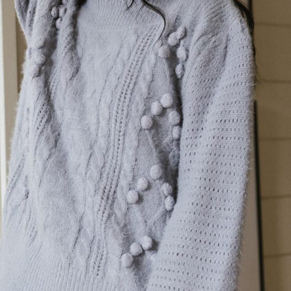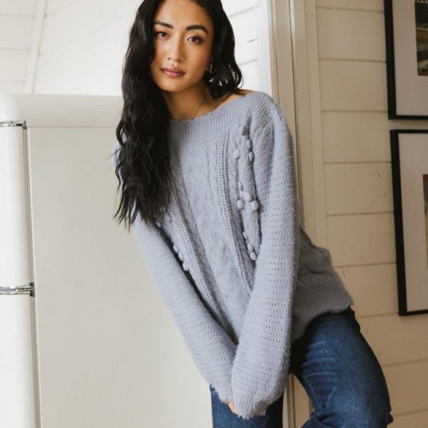 Scalloped Hem Cable Knit with Pom Pom Accents Pointelle Sleeves Long Sleeves Stretch Knit Material 50% Acrylic, 50% Nylon Hand Wash Cold, Line Dry  Model Info  Height: 5’8″  Wearing Size: Small