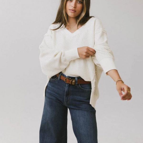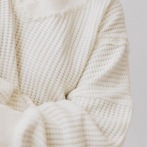 Ribbed V Neckline Long Sleeves Drop Shoulder Two Hem Slits Exposed, Distressed Seams Boxy, Oversized Fit Slightly Stretchy Waffle Knit 90% Cotton, 10% Polyester Machine Wash Cold, Tumble Dry Low  Model Info Height: 5’5″ Wearing Size: X-Small