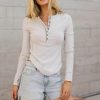 Wide Neck  Seven Buttons on Front Contrast Stitching Detail Ribbed Stretch Material Raw Hem Long Sleeves with Thumb Holes Scoop Hemline 62% Polyester, 21% Cotton, 13% Rayon, 4% Spandex Machine Wash Cold, Tumble Dry Low  Model Info Height: 5’7″ Wearing Size: X-Small