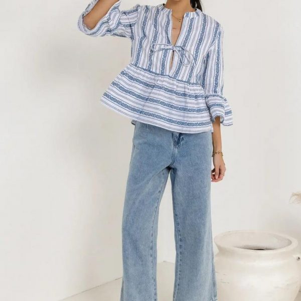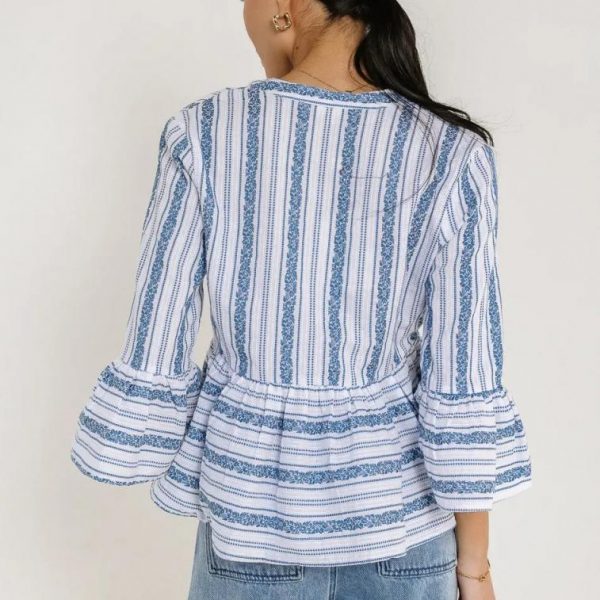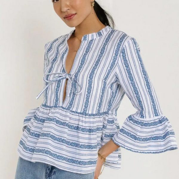 Peplum Style Woven Top Plunge V-Neck With Tie Detail 3/4 Flounce Sleeves Striped Pattern Non-Stretch Material 100% Cotton Hand Wash Cold, Flat Dry  The Eren Woven Top is truly one of a kind. This peplum style blouse perfect for any occasion from running errands to dinner parties. Dress it up with your favorite colored denim and strappy sandals. Model Info Height: 5’8″ Wearing Size: Small Measurements: Bust: 35″, Length: 21.5″