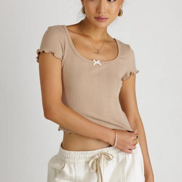 Square Neckline with Front Ribbon Accent Short Sleeves Pointelle-Patterned Stretch Knit Material Cropped Fit 80% Polyester, 14% Rayon, 6% Spandex Hand Wash Cold, Line Dry Model Info Height: 5’8″ Wearing Size: Small