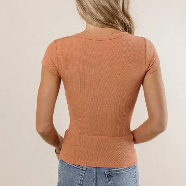 U Neck Short Sleeves Stretch Ribbed Knit Material 92% Rayon, 8% Spandex Machine Wash Cold, Hang or Tumble Dry Low Model Info Height: 5’7″ Wearing Size: X-Small