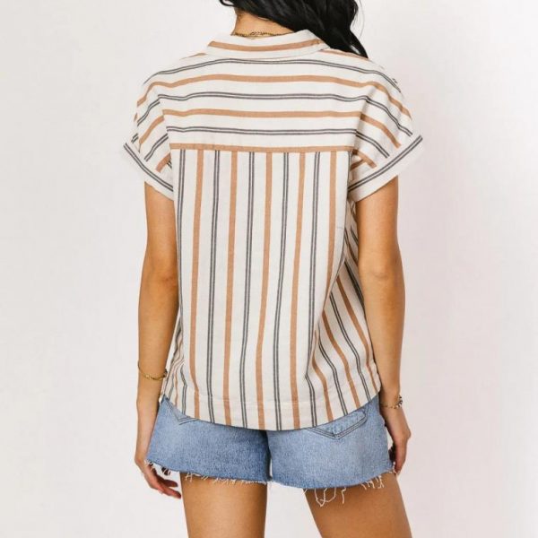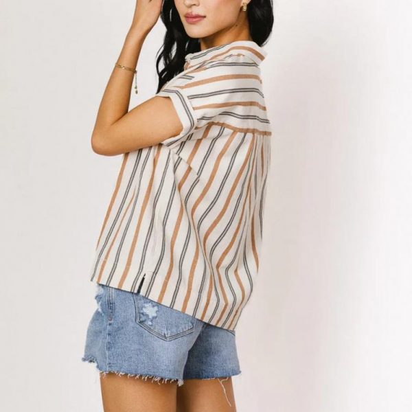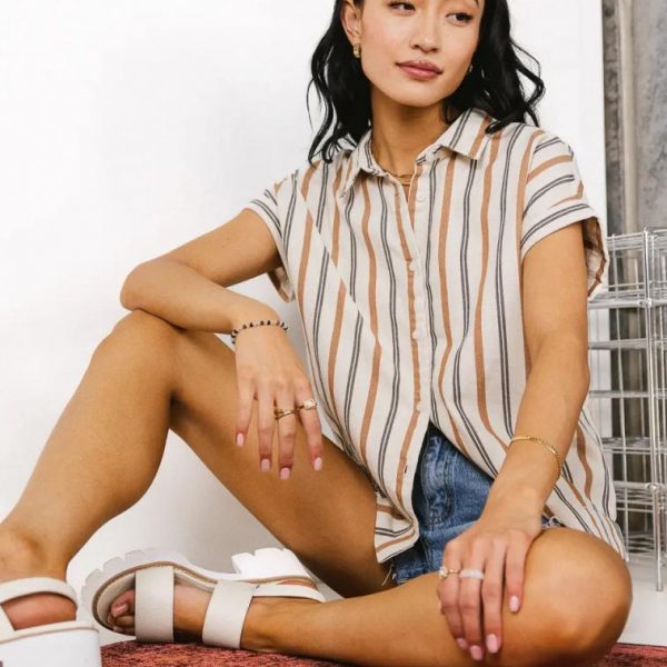 Collared Neckline Seven Button Closure Short Sleeves with Rolled Cuffs Contrast Stripe Detail on Back 100% Cotton Hand Wash Cold, Dry Flat The Gabby Striped Button Up in Tan is a neutral lover’s next “it” item. This top is perfect for easy, breezy outfits. Grab a layering piece and some bottoms and wear this top unbuttoned. Model Info Height: 5’8″ Wearing Size: Small