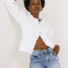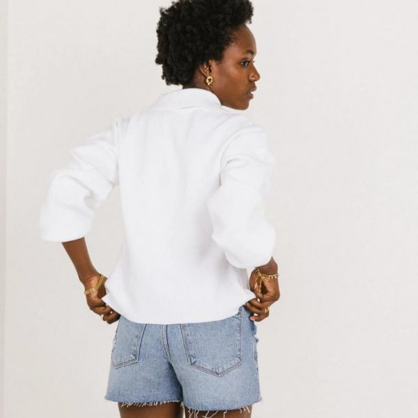 Collared Neckline Long Sleeves Front Button Closure Stretch Knit Material 50% Viscose, 28% Polyester, 22% Nylon Hand Wash Cold, Hang Dry Model Info Height: 5’5” Wearing Size: X-Small