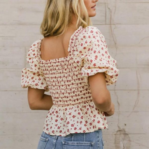 Square Ruffled Neckline Elastic Shoulders Short Puff Sleeves Elastic Sleeve Cuffs Smocked Bodice Peplum Silhouette Slightly See Through Self: 100% Cotton Lining: 100% Rayon  Model Info Height: 5’7″ Wearing Size: X-Small