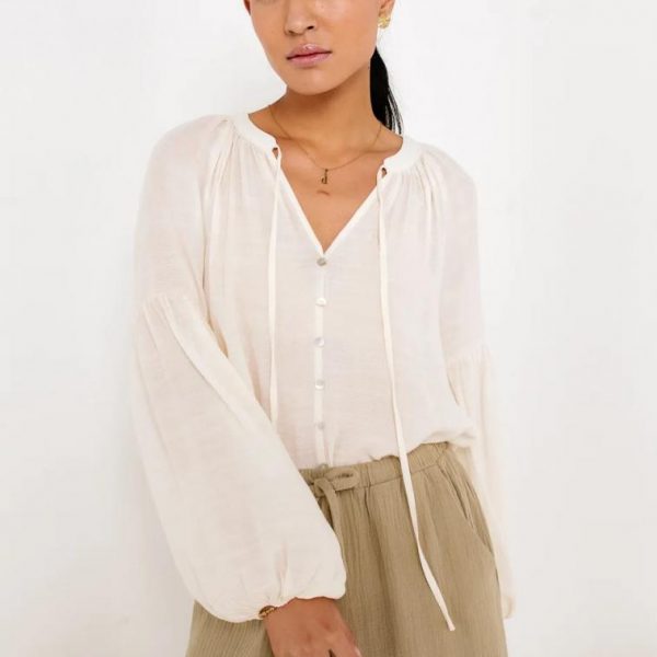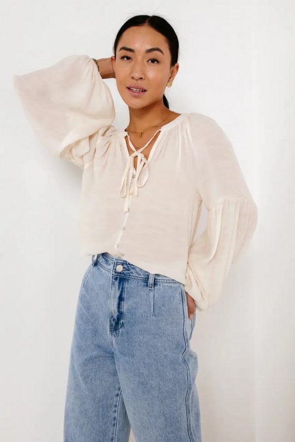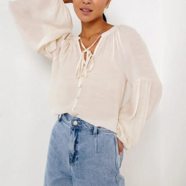 Round Neckline Long Balloon Sleeves with Elastic Cuff Front Keyhole Cut Out Tie Closure Non-functioning Front Buttons 100% Polyester Hand Wash Cold, Hang to Dry Model Info Height: 5’8″ Wearing Size: Small Measurements: Bust: 40″, Length: 25″ **For more specific information on the product, please feel free to email us at webteam@ bohme