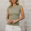 Crew Neckline  Stretch Ribbed Material Raw Hem Seam Detail on Back Cap Sleeves 65% Cotton, 30% Polyester, 5% Spandex Machine Wash Cold, Tumble Dry Low  The earth tones of the Huxley Tank in Olive has us feeling so Zen. Ride that relaxation wave by wearing this top to yoga, or a meditation session. Pair with some leggings or a onesie jumpsuit. Model Info  Height: 5’7”  Wearing Size: X-Small