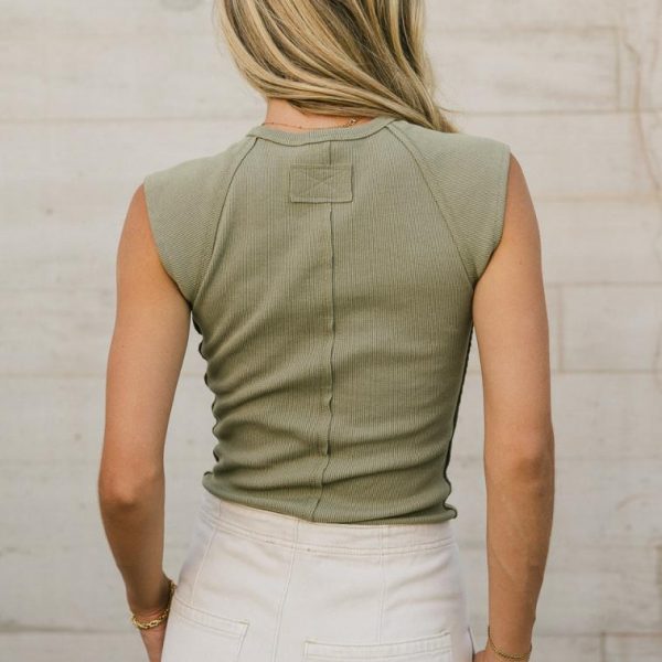Crew Neckline  Stretch Ribbed Material Raw Hem Seam Detail on Back Cap Sleeves 65% Cotton, 30% Polyester, 5% Spandex Machine Wash Cold, Tumble Dry Low  The earth tones of the Huxley Tank in Olive has us feeling so Zen. Ride that relaxation wave by wearing this top to yoga, or a meditation session. Pair with some leggings or a onesie jumpsuit. Model Info  Height: 5’7”  Wearing Size: X-Small