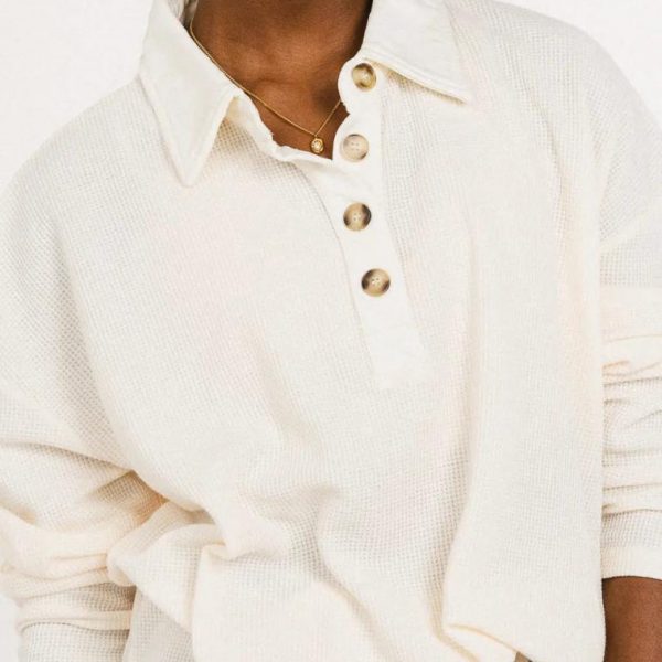 Collared Neck Four Buttons Long Sleeves Stretch Waffle Knit Material 55% Polyester, 45% Cotton Hand Wash Cold, Hang or Line Dry Model Info Height: 5’5″ Wearing Size: Small