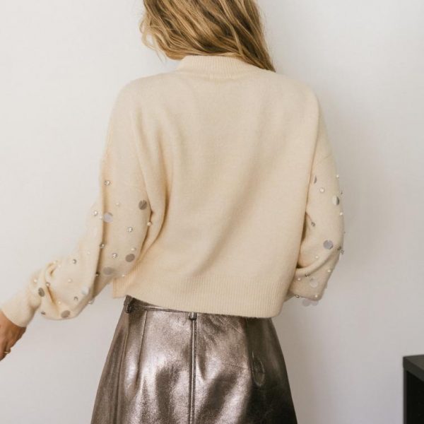 Thick Round Neckline Long Sleeves Sleeves Have Embellished Faux Pearls, Faux Rhinestone and Sequins Stretch Knit Material 74% Acrylic, 22% Polyester, 4% Spandex Hand Wash Cold, Line Dry  Model Info  Height: 5’8”  Wearing Size: Small