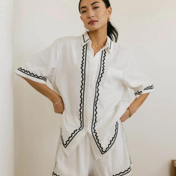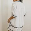 Collared Neckline Embroidered Border Hidden Seven Button Closure Short Sleeves Scoop Hemline One Chest Pocket on Left See Through Material Non Stretch Material 70% Viscose, 30% Linen Hand Wash Cold, Hang Dry Matching Pieces Sold Separately   Model Info Height: 5’8″ Wearing Size: Small