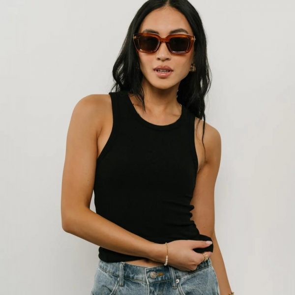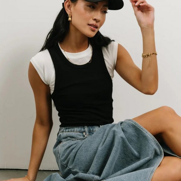 Scoop Neck Stretch Ribbed Material 97% Rayon, 3% Spandex Machine Wash with Cold Water, Tumble Dry Low White top sold separately Model Info Height: 5’8″ Wearing Size: X-Small X-Small Measurements: Bust: 24″, Length: 23.5″ **For more specific information on the product, please feel free to email us at webteam@bohme