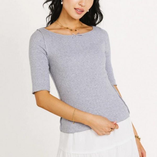 Boat Neck Stretchy Ribbed Knit Exposed Serged Seams Exposed Raw Seams Bow Detail on Neckline 3/4 Sleeve Fitted Body Slightly See Through 100% Cotton Machine Wash Cold, Hang or Tumble Dry Low  The Kippin Fitted Top in Grey is an essential for the warmer weather. This basic top is easy to layer and style. We recommend grabbing a denim jacket and a flowy skirt to strut your stuff. Model Info Height: 5’8″ Wearing Size: X-Small