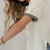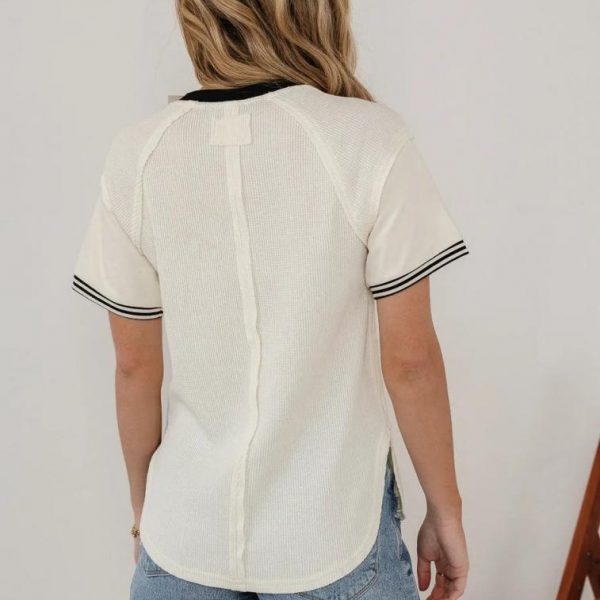 Rounded Neckline Stripe and Contrast Sleeves Scoop Hemline Slightly Sheer Waffle Body Tag Panel and Seam Detail on Back Seam Detail From Neckline to Armpit Body: 65% Polyester, 35% Cotton Stripe: 100% Cotton Machine Wash Cold, Hang or Tumble Dry  The Lacy Waffle Tee is designed with the everyday moments in mind. From running errands, to dinner dates this tee shines. Try it with a black midi skirt and some strappy heels for a casual Friday at the office.  Model Info Height: 5’7″ Wearing Size: X-Small Measurements: Bust: 34″, Length: 26.5″ **For more specific information on the product, please feel free to email us at webteam@bohme