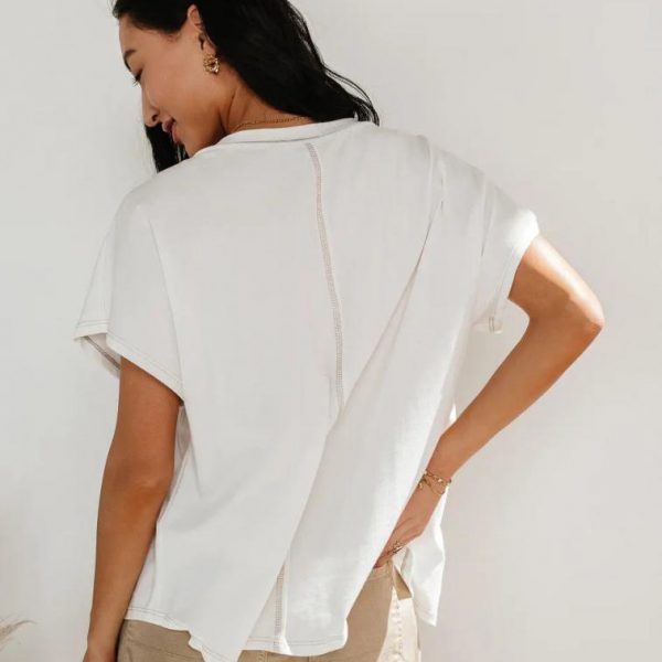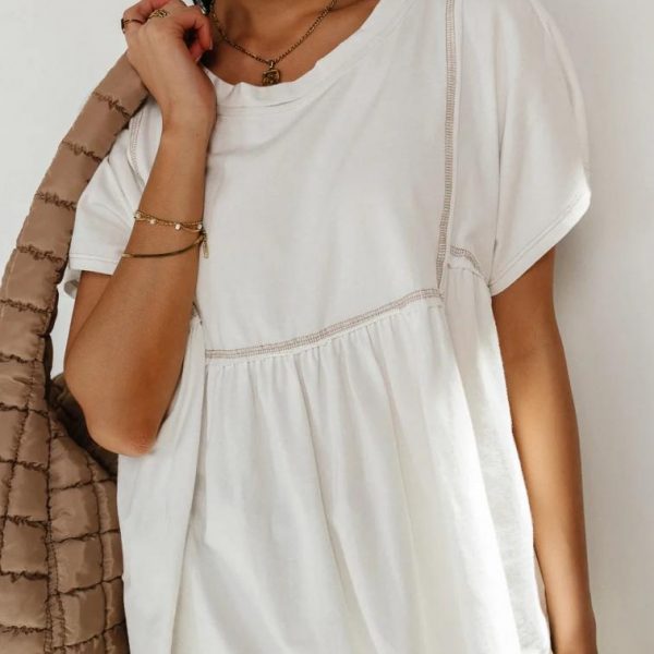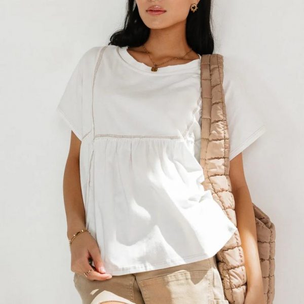Stretchy Peplum Style Top Round Neckline Exposed Flatlock Stitching Detail Short Sleeved Boxy Fit Stretch Material 95% Cotton, 5% Spandex Hand Wash Cold, Hang Dry Model Info Height: 5’8″ Wearing size: Small Small Measurements: Bust: 45″, Length: 25″ **For more specific information on the product, please feel free to email us at webteam@bohme