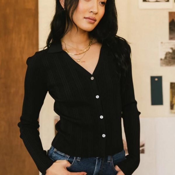 Collared Neckline Long Sleeves Front Button Closure Stretch Ribbed Material 65% Viscose, 35% Nylon Hand Wash Cold, Hang Dry Model Info Height: Wearing Size: X-Small